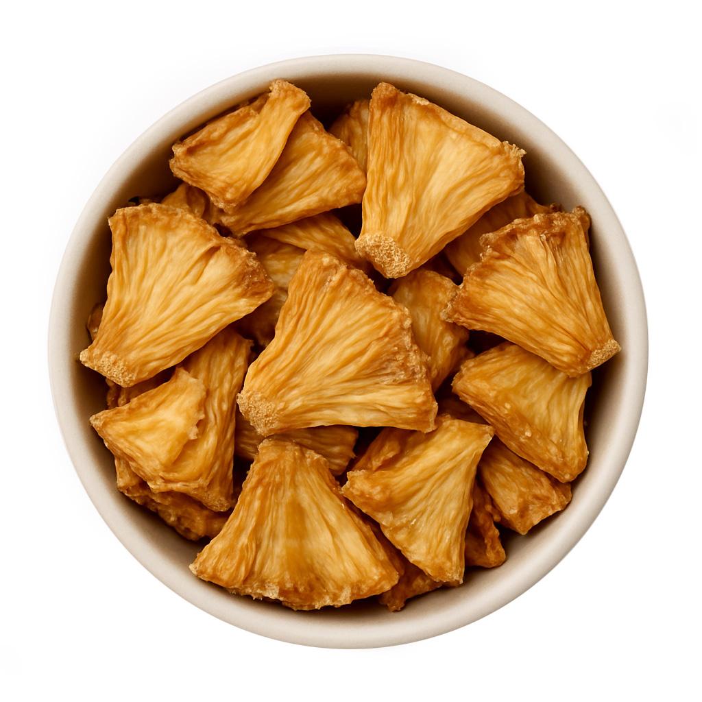 Getrocknete Ananasstücke. Sie sind ca. 2 bis 4 mm dick und ca. 15 bis 35 mm groß. Das goldgelbe Fruchtfleisch ist arteigen süß und schmeckt fruchtig sauer. Getrocknete Ananas ist ballaststoffreich. Sie schmeckt pur als Snack und in Mischungen.