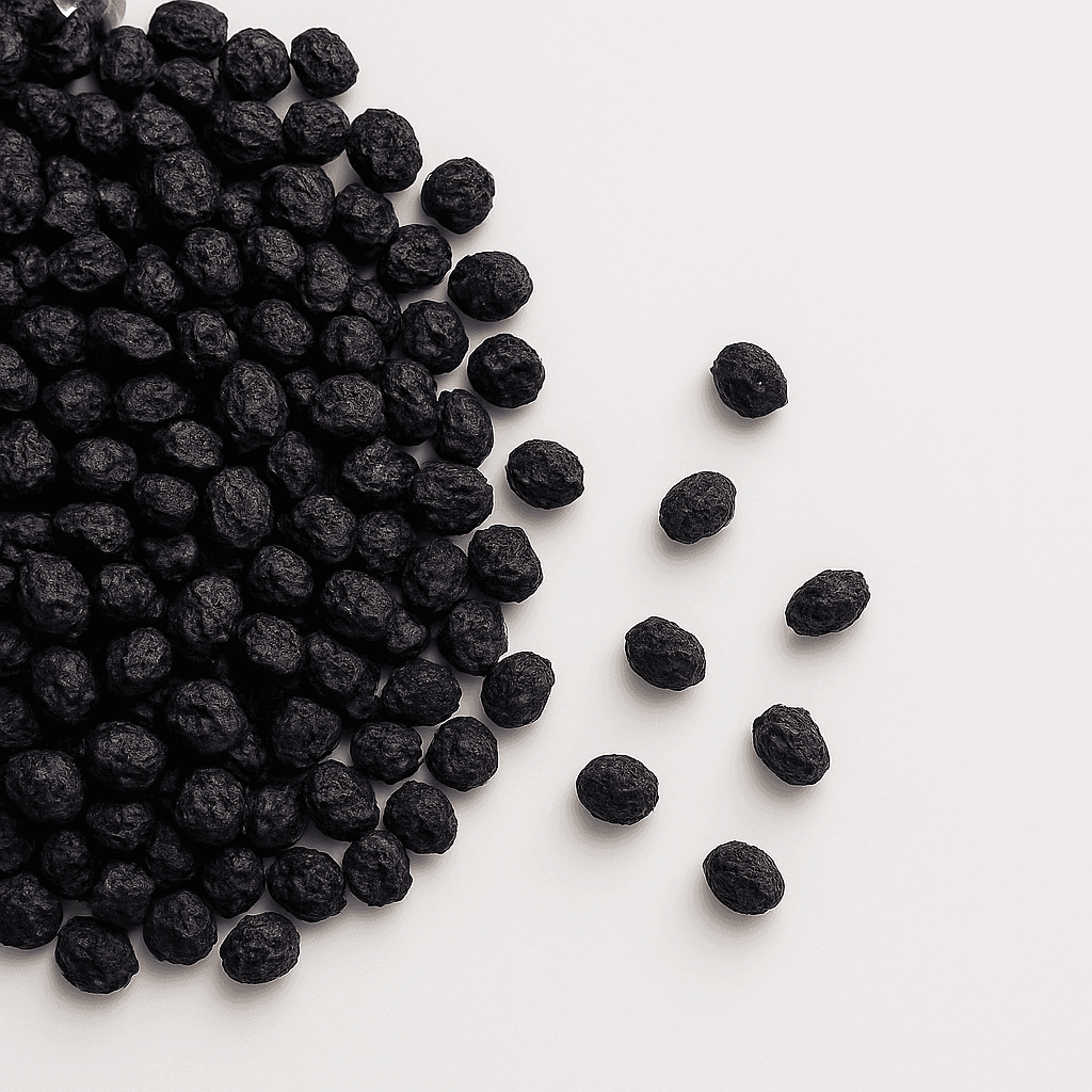 Bagas de Aronia secas. São crocantes a duras e têm uma cor roxa escura a preta. As bagas de Aronia são consideradas um superalimento e são uma excelente fonte de fibras. São ideais para muesli e como cobertura.