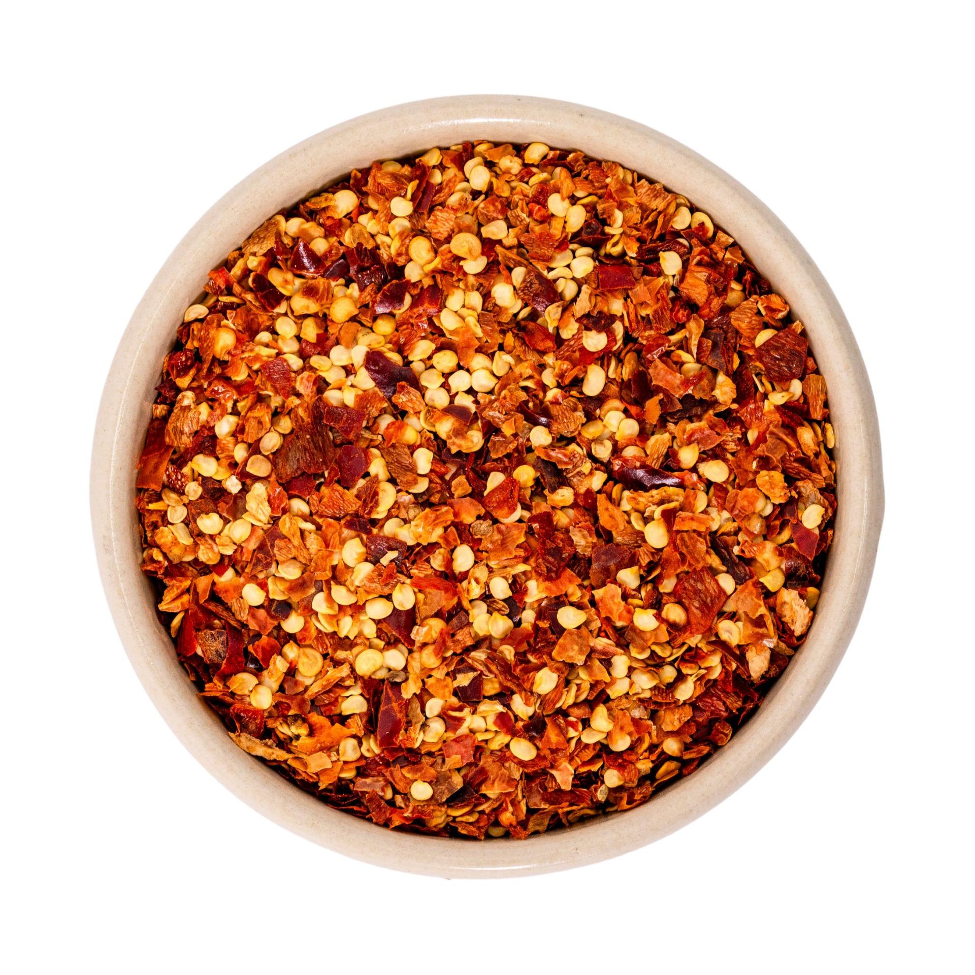 Pimentas secas trituradas, com cerca de 1 – 5 mm com semente. Eles têm um sabor medio-picante, levemente frutado e surpreendem pela sua jogada de cores vermelho-amarelas. A produção dos nossos chilis começa com a seleção cuidadosa e colheita das pimentas vermelhas maduras. Em seguida, eles são secos com cuidado para preservar o seu rico, sabor temperado e a sua cor vermelha viva. Por fim, as pimentas secas são trituradas e cuidadosamente embaladas. O nosso chili pode ser utilizado em uma variedade de pratos. Ele dá uma pitada temperada a sopas, guisados, molhos e marinadas. Também realça pratos grelhados e dá o sabor autêntico a pratos mexicanos ou indianos. Um pinho de chili também dá uma pitada surpreendente aos seus sucos ou aos doces de chocolate.