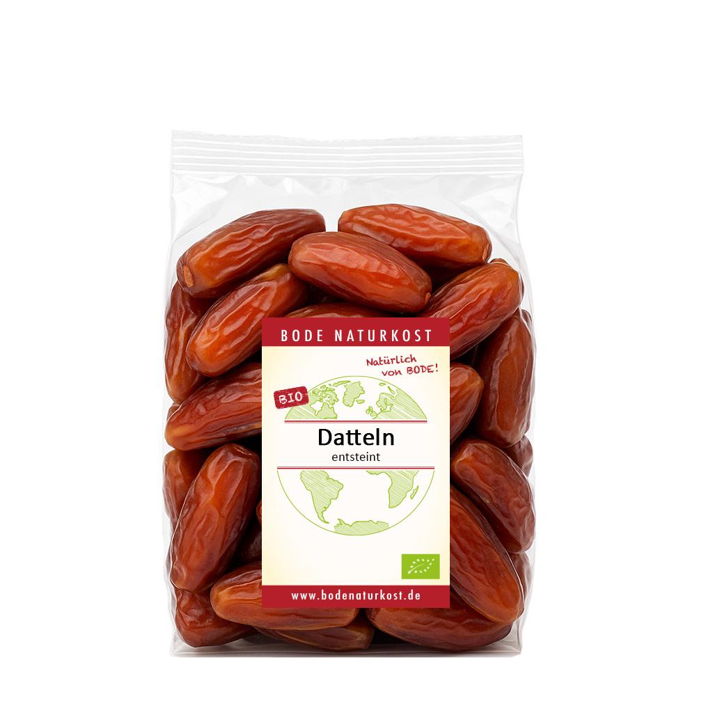Datilas orgânicas Deglet Nour sem caroço e secas. Os dedos da luz, como as frutas doces são chamadas em tradução, são de cor marrom-médio a clara e têm entre 3 e 5 cm de comprimento. Eles são macios a médio-firmes na mordida, têm um sabor doce e frutado agradável e são uma boa fonte de fibras. Isso torna as datilas em uma delícia natural e deliciosa e em um ingrediente popular na padaria e culinária. Onde quer que seja necessária doçura natural, elas são o ingrediente ideal: pão de frutas, bolos, recheios de bolos, barras de cereais, bolas de energia e picadas finamente como cobertura doce em cereais, porridge ou salada. As datilas Deglet Nour realçam com sua doçura delicada também currys e pratos de tomate. Experimente por si mesmo. As principais regiões produtoras das nossas datilas são a Tunísia e a Argélia.
