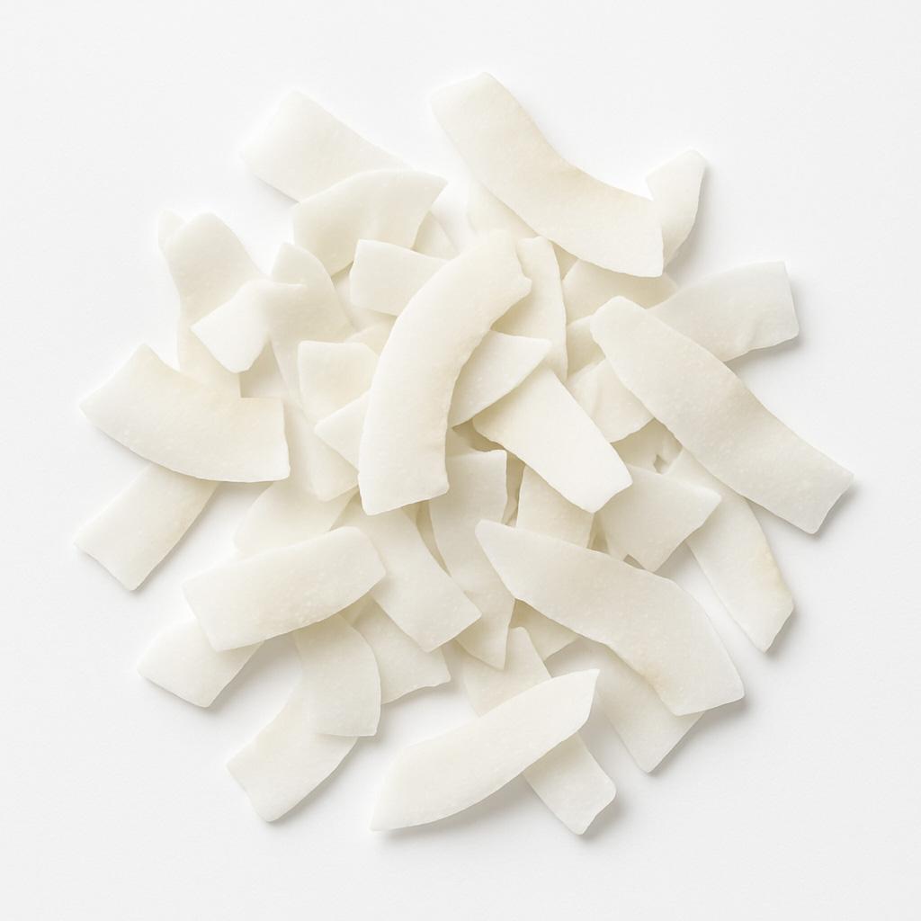 Lascas de coco sem açúcar. As lascas são brancas, têm um sabor doce e fresco e uma consistência crocante. As lascas de coco são ricas em fibras. São deliciosas como lanche ou adição a misturas, sobremesas e muesli.