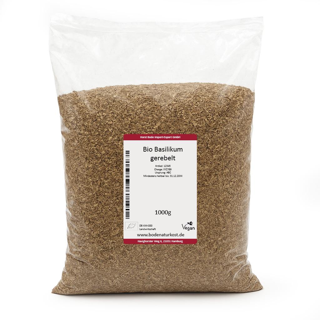 Folhas de manjericão picado e secas. O manjericão, também conhecido como alface-grega, é uma erva aromática essencial em qualquer cozinha. Muitos pratos italianos, como molho de tomate, massa, pesto ou pizza, são quase impensáveis sem o manjericão. É adequado para cozinhar e fritar.